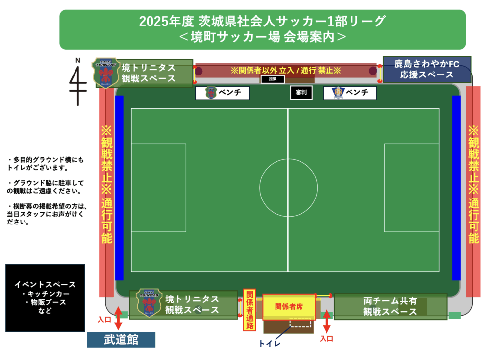 ・日傘のご準備をオススメいたします。また、境町サッカー場は「イス」のお持ち込みが可能です。