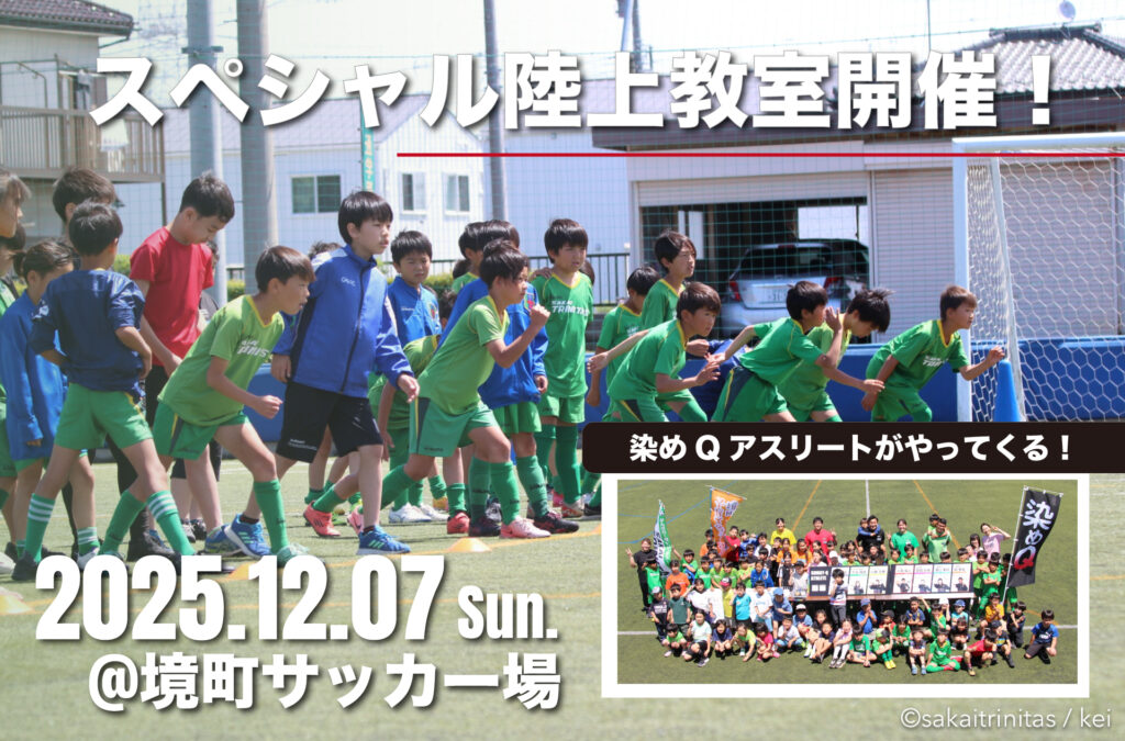 この度、株式会社染めQテクノロジィ様(染めQアスリートの皆様)ご協力のもと、12/7(日)に「第2回 プロが教える陸上教室!」を境町サッカー場にて実施いたします。